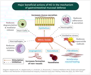 With aging, our bodies slow down and produce neurotransmitters at a slower and lesser degree. There are supplements and foods you can consume to support the body’s production of nitric oxide. However, with acupuncture, the body gets a jumpstart where your cells are stimulated to produce nitric oxide feeling the effects of increased blood flow within minutes. Many of my patients who received acupuncture for the first time noted how they could feel the blood flowing through their body, in somewhat disbelief as their body would relax deeply. Acupuncture is another effective resource to prevent heart disease and keep your heart healthy and happy. The diagram below illustrates how nitric oxide helps modulate the immune response and benefit the gastrointestinal system. Hence, acupuncture can benefit your health in both short and long term.
