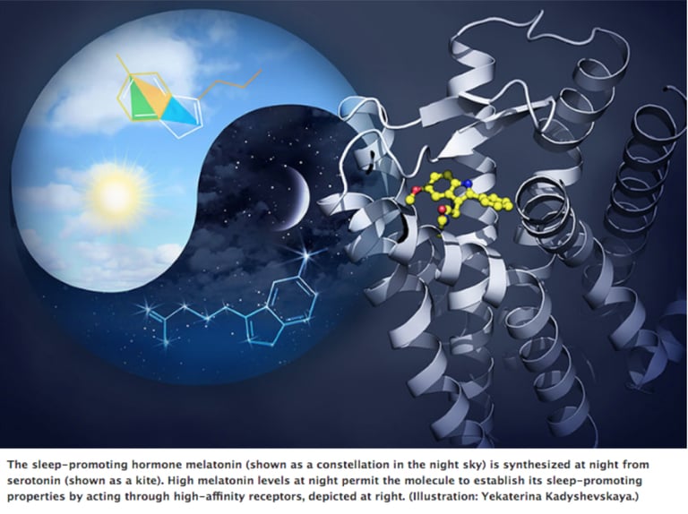 Earlier in 2019, researchers used the concept of Yin Yang as a model to explain the interdependence of melatonin synthesis from serotonin for promoting sleep. This example of melatonin-serotonin synthesis illustrates the dynamic relationship of Yin Yang to explain the sleep cycle. Melatonin is associated with promoting sleep and therefore is considered to be Yin, relative to serotonin which is Yang. Sun/Daylight helps promote the production of serotonin (Yang). From an eastern perspective, serotonin would be considered to be Yang, as serotonin is a neurotransmitter that promotes activity, cognitive functions, a happy mood and healthy gut function. And appropriate levels of serotonin motivate us to perform daily activities. But serotonin is needed as a precursor for melatonin synthesis and therefore serotonin and melatonin are interdependent. Melatonin would be considered to be Yin as it aids in sleep. Or in other words, the Yin functions are for the most part the parasympathetic (aka, rest and repair) responses which often happen when we are resting or asleep, while the Yang functions are the sympathetic responses.